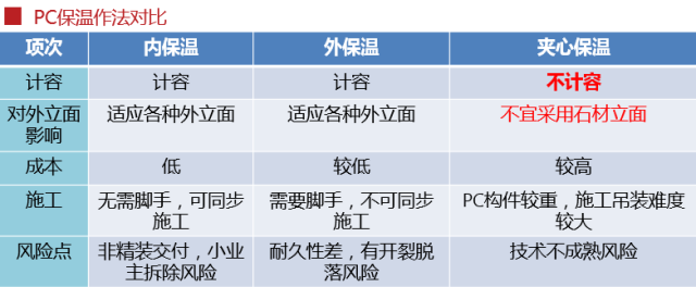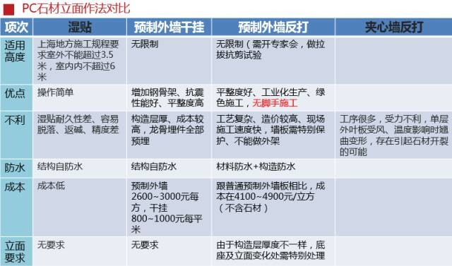 BIM模拟连接节点 装配式建筑对很多现有的建筑做法都有不同的影响,其中对外墙保温做法和石材立面做法的影响最为明显,下面两张表,清楚对比了各种做法的优缺点、成本和施工因素、适用性等方面。 |