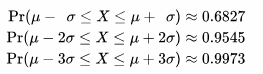 在统计上,68–95–99.7原则是在正态分布中,距平均值小于一个标准差、二个标准差、三个标准差以内的百分比,更精确的数字是68.27%、95.45%及99.73%。若用数学语言表示,其算式如下,其中X为正态分布随机变数的观测值,μ为分布的平均值,而σ为标准差: